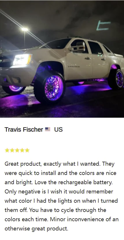 One of the best products for all car enthusiasts. These Premium Led Wheel Lights are the perfect addition to your car, bike, or motorcycle. This product is so easy to use. The motion-activated lights automatically turn on when the vehicle moves, and they're perfect for safety at nighttime, bad weather, and simply looking cool. Simply screw it onto the tire valve to install it, and enjoy the super-bright, energy-saving, long lifespan of the LED.