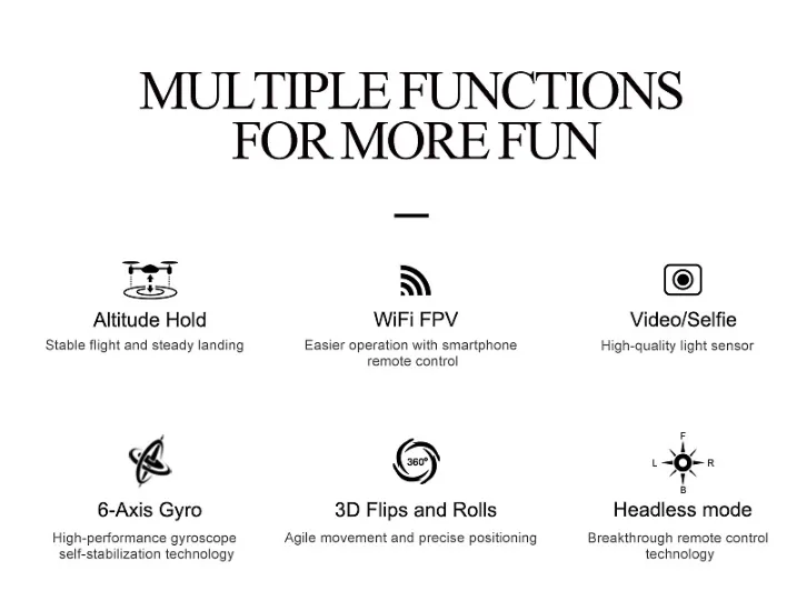 - WiFi FPV Camera: Stream live video to your smartphone for real-time flying.