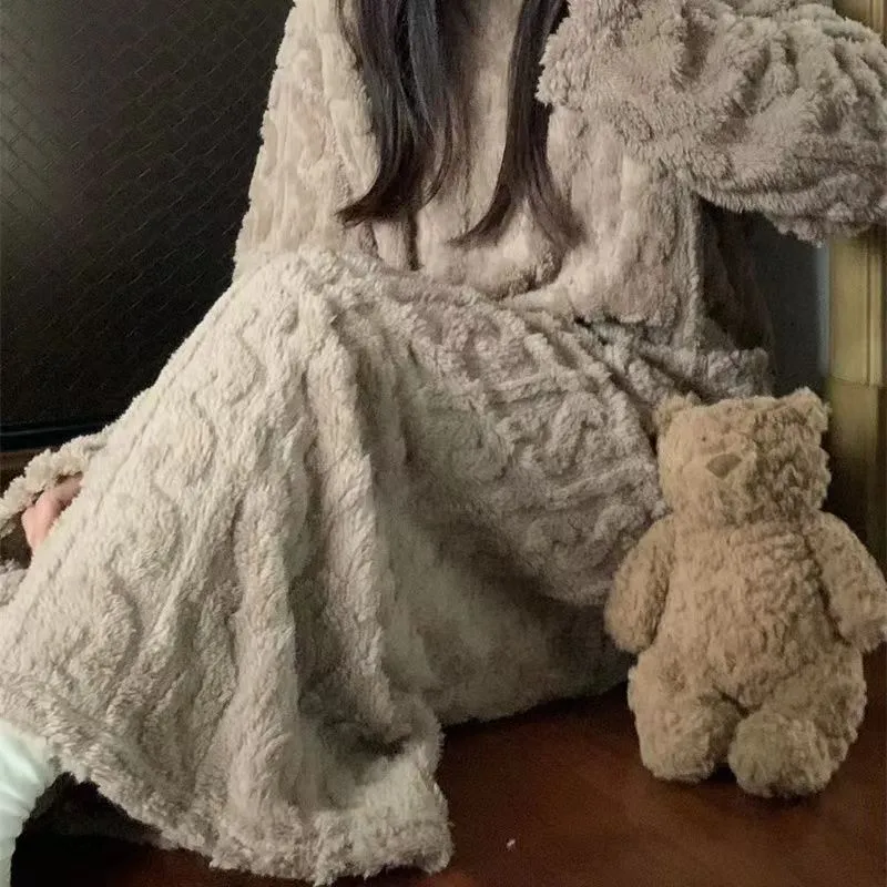 Winter Coral Fleece Sleepwear Women's Nightgown Long Night Dress Pajamas With Pockets Thickened Jacquard Dress Warm Home Clothes