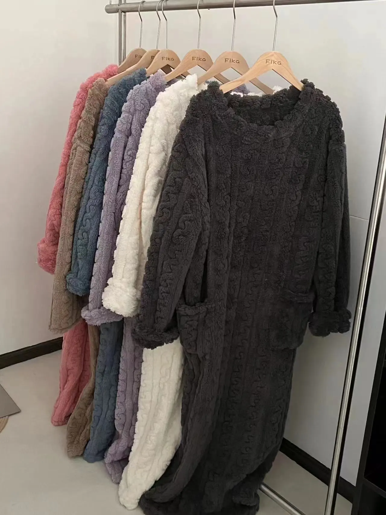 Perfect for the cold season, this coral fleece night dress is a versatile addition to your home wardrobe. Whether you are winding down after a long day or enjoying a lazy weekend morning, this warm and stylish nightgown wraps you in comfort. Its thickened fabric is easy to maintain and durable, ensuring it remains soft and cozy wash after wash. Embrace the winter season with a blend of style and warmth with our jacquard night dress, the ideal choice for cozy home living.