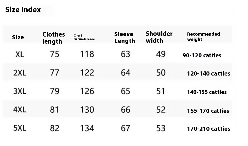 Size: XL recommend 45.00kg,2XL recommend kg,3XL recommend 70.00kg,4XL recommend 77.50kg,5XL recommend 85.00kg