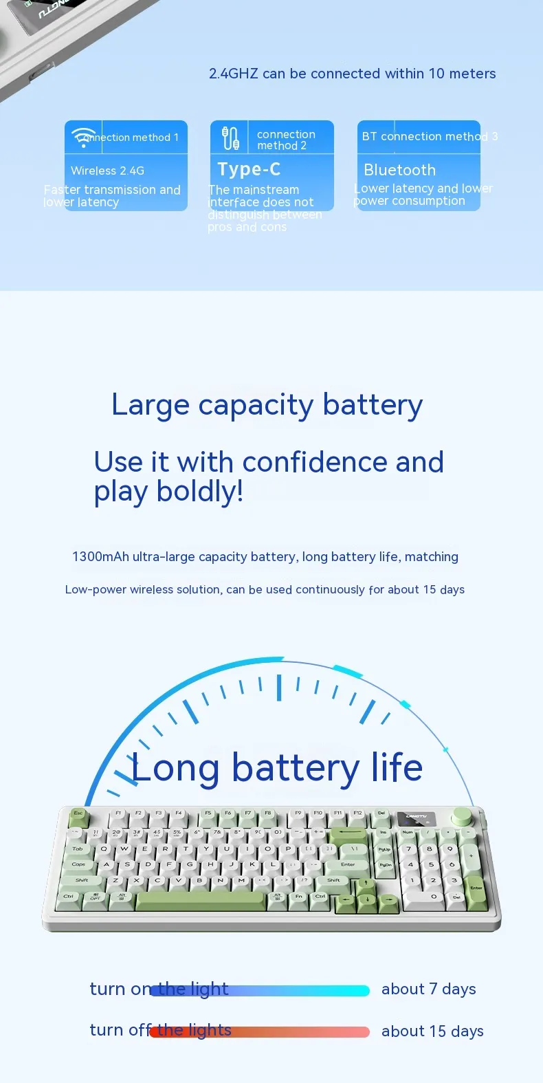 With its efficient power management system, this keyboard boasts a long battery life, allowing you to work or play for hours on a single charge. It features an auto-sleep function to conserve energy when not in use, making it both environmentally friendly and convenient.