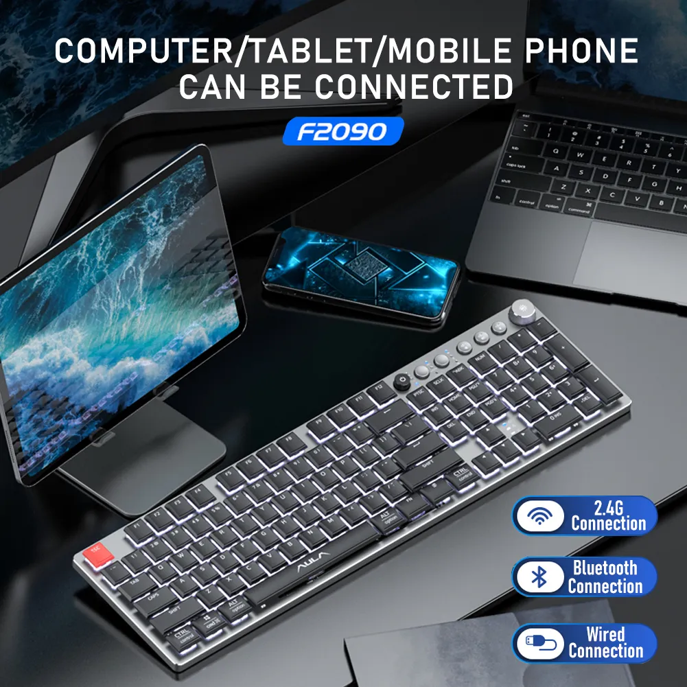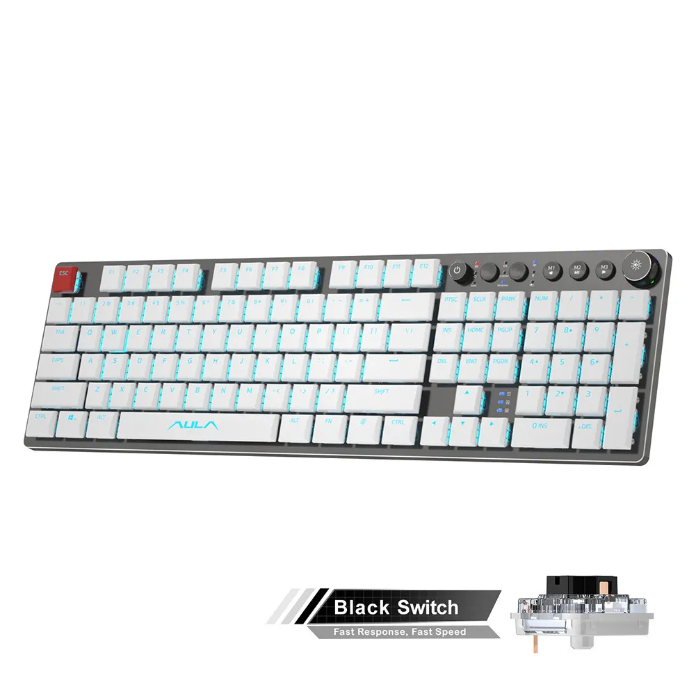 The 104 keys provide a full range of functionality, while the wireless Bluetooth connection ensures you’re free from the clutter of wires. With RGB backlighting and customizable key switches, you can tailor the keyboard to your personal style and preferences, making it perfect for any setup, whether at home or in the office.