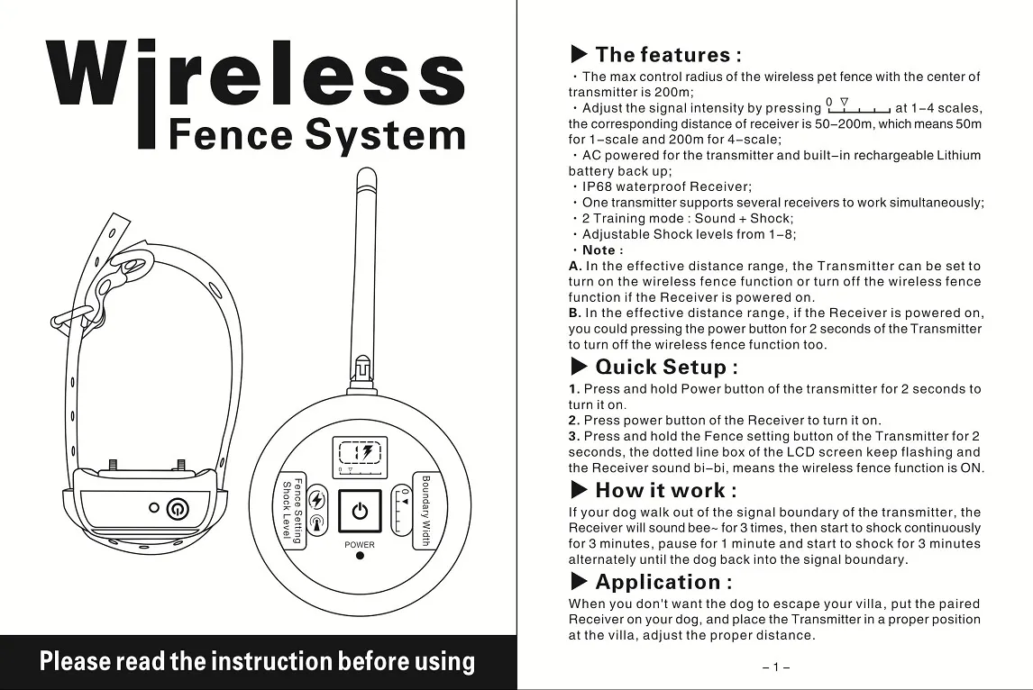 In conclusion, the Wireless Pet Fence Electric Waterproof Intelligent Training Collar is a versatile tool for pet owners looking to enhance their pet’s safety and obedience training. With its wireless boundary control, adjustable correction modes, and waterproof design, this collar ensures that your pet stays secure while learning positive behaviors. Ideal for both indoor and outdoor use, it provides a convenient, effective solution to training and containment.