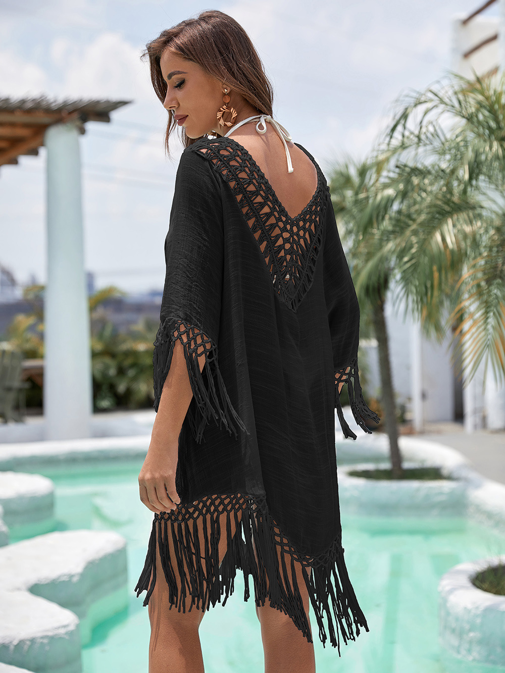 Upgrade your summer wardrobe with our Women Hollow V-neck Oversized Blouse. This stylish blouse features a hollow design that adds a unique