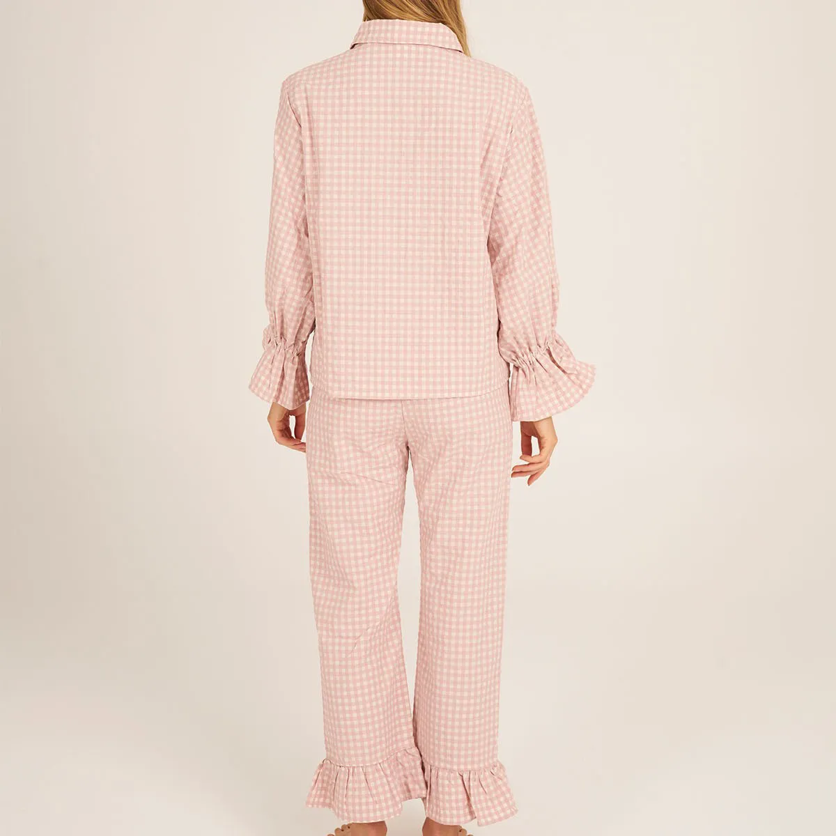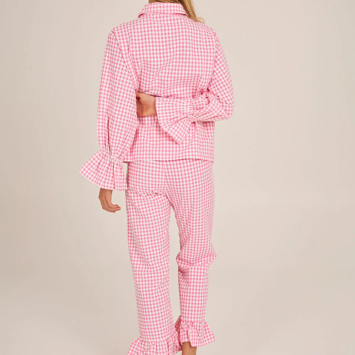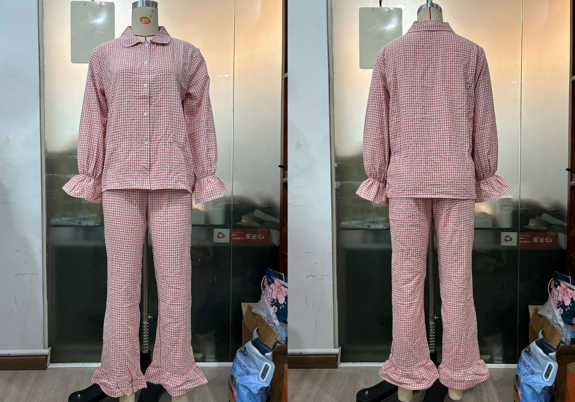 - Style: Two piece gingham outfits pajama, front tie up plaid shirt lounge pants set, loungewear set women, ruffle pants pj set, tie front peplum pajama set, matching ph set for women sleepwear.