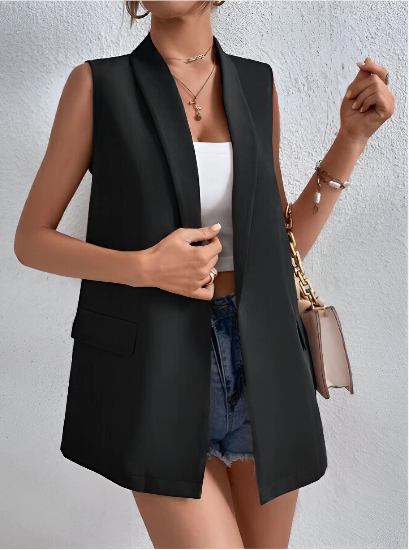 perfect for layering over your favorite tops. The buckle-free design offers a clean and modern appearance, while the lightweight fabric ensures comfort throughout the day. Ideal for work, meetings, or any professional setting, this vest pairs well with skirts, pants, or