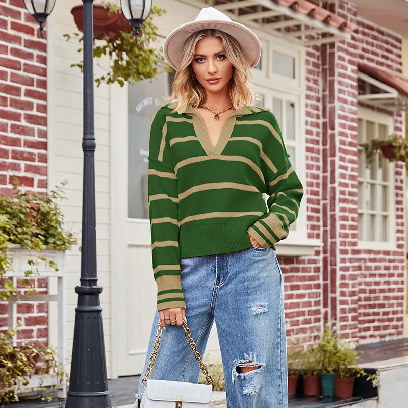 Women's Fashion Patchwork Stripes Lapel Loose Sweater