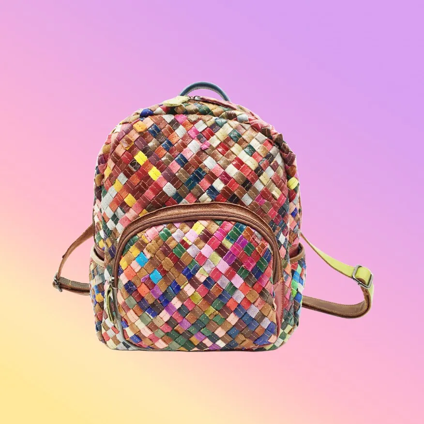 The hand-woven leather and bold stitching colors make this backpack a standout accessory that complements both casual and formal looks.
