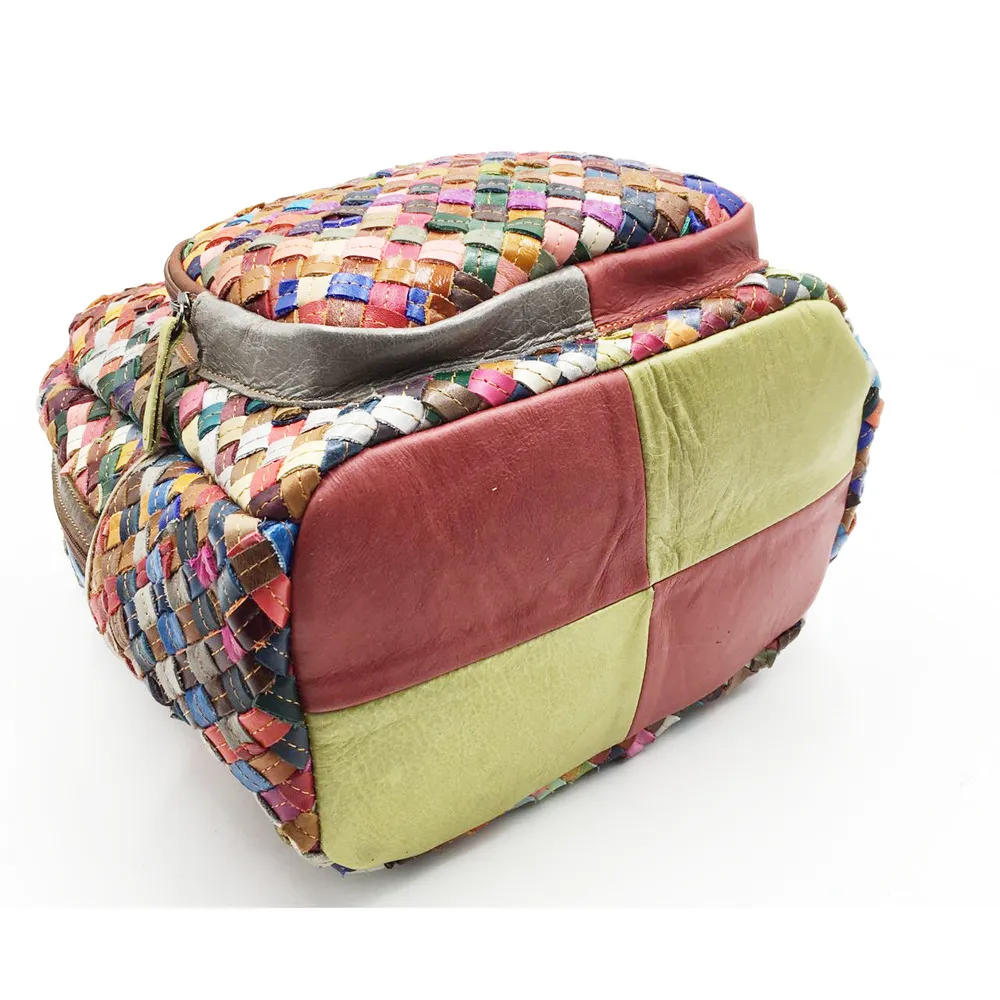 functionality. Featuring intricate hand-woven cowhide leather and a bold color-stitching design, this backpack is perfect for women who