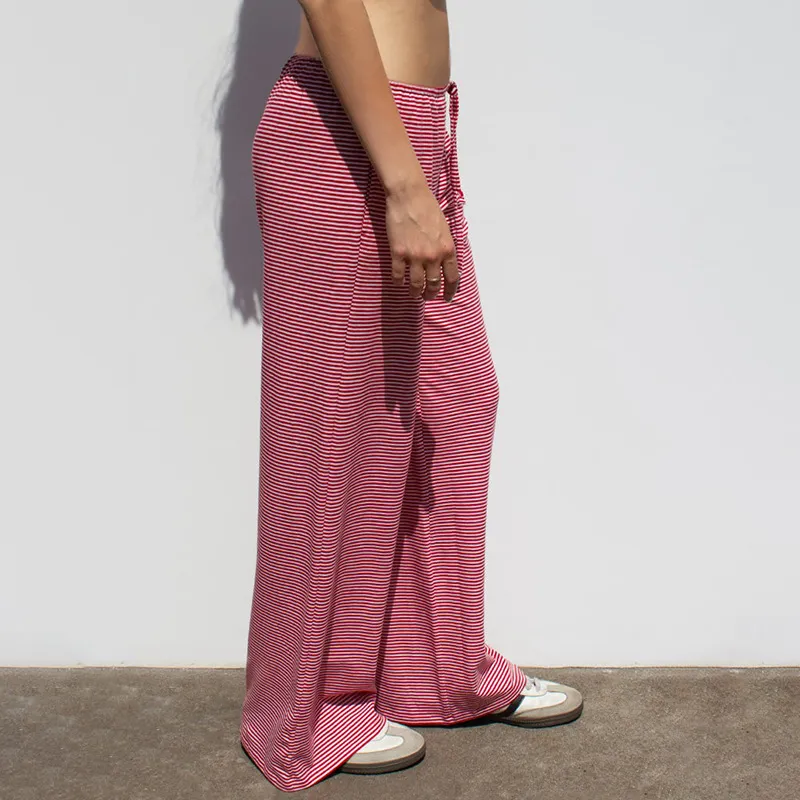 The wide-leg design is not only comfortable but also flattering, giving your outfit a chic, effortless flow. The striped print brings a bold and trendy statement to your wardrobe, adding a touch of nostalgia with its Y2K-inspired aesthetic. The lace-up front adds a playful yet practical detail, allowing you to adjust the waist for a personalized, snug fit. These trousers feature a straight-leg cut that complements all body types, making them a go-to choice for various occasions—from casual outings to stylish homewear.