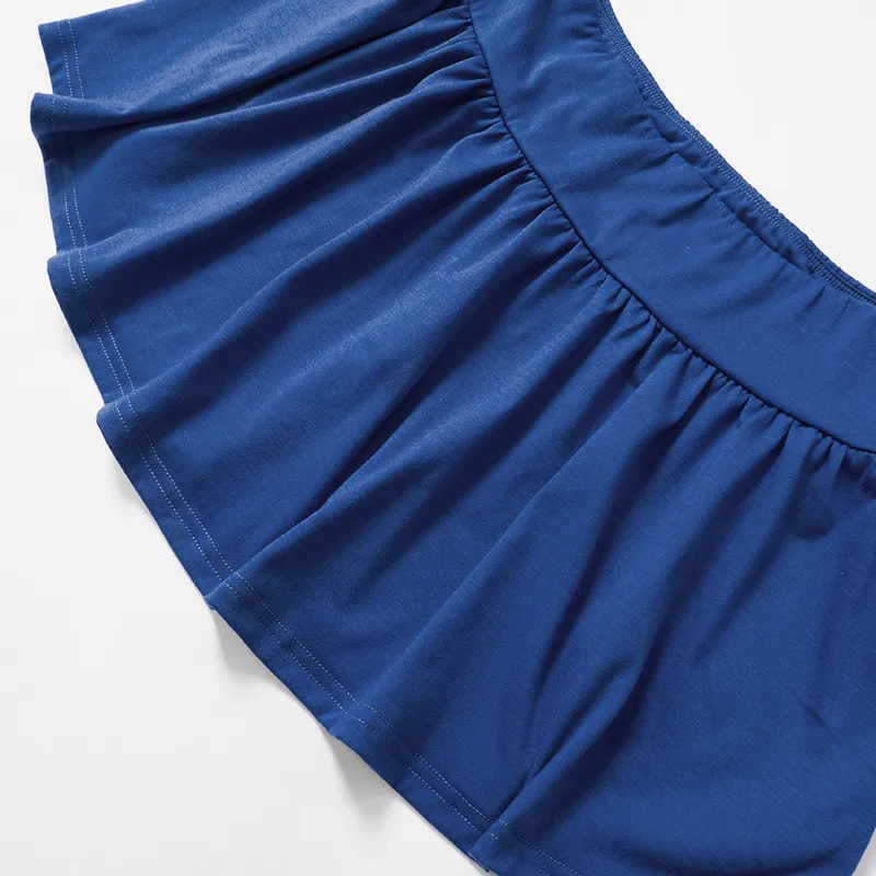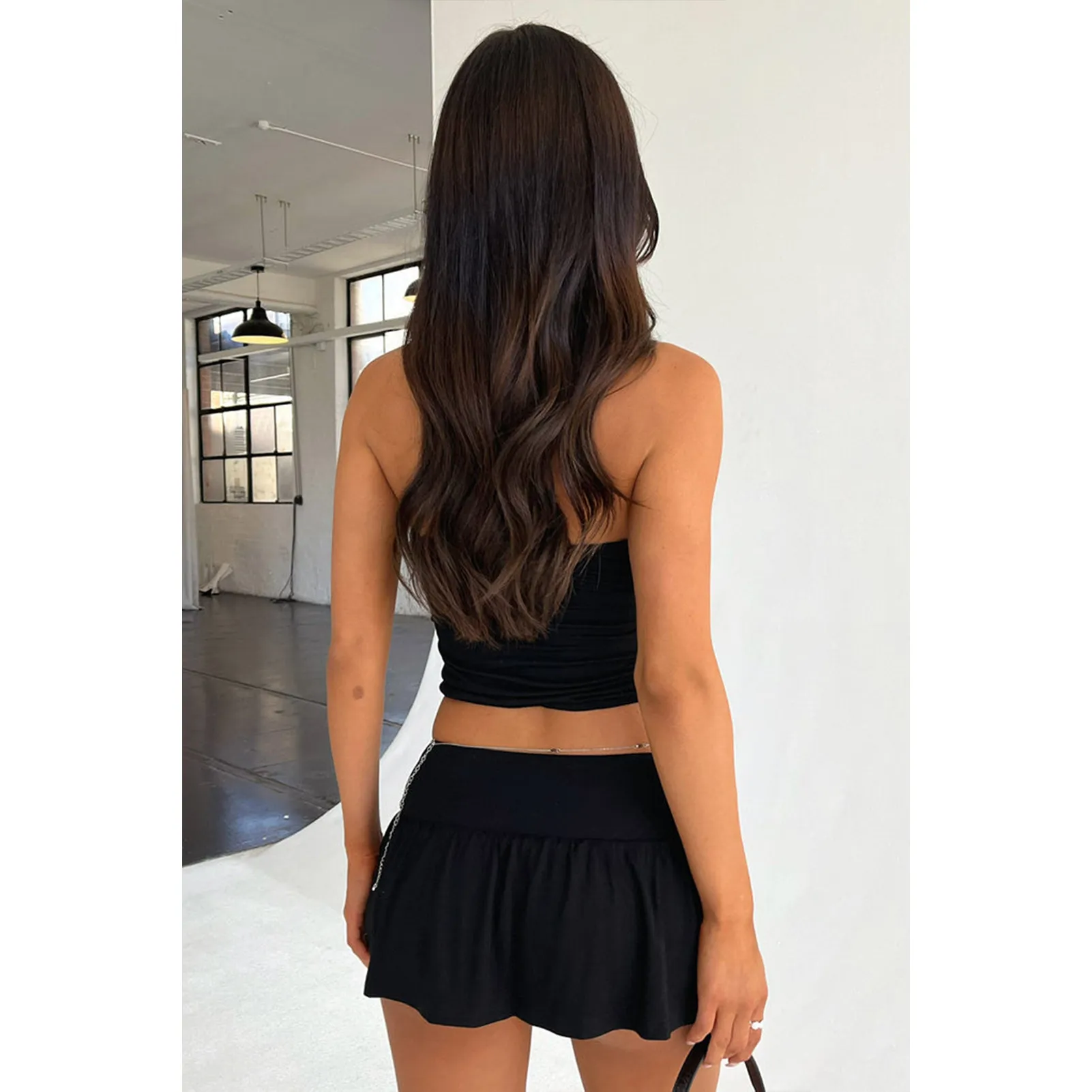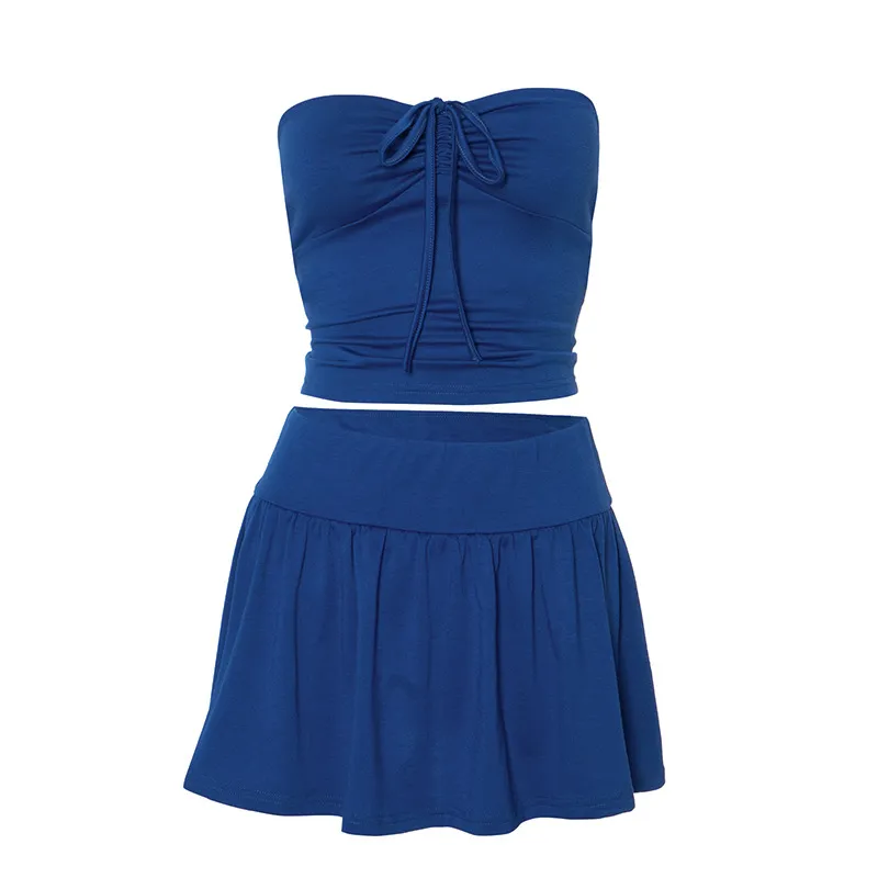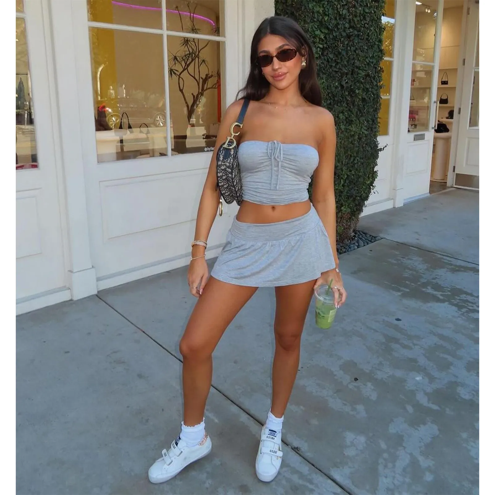 - (Style)This y2k skirt set features a strapless crop top that accentuates a confident bust, slim fit with ruched straps, mini skirt with double-layered material lined shorts to stay moderately covered.