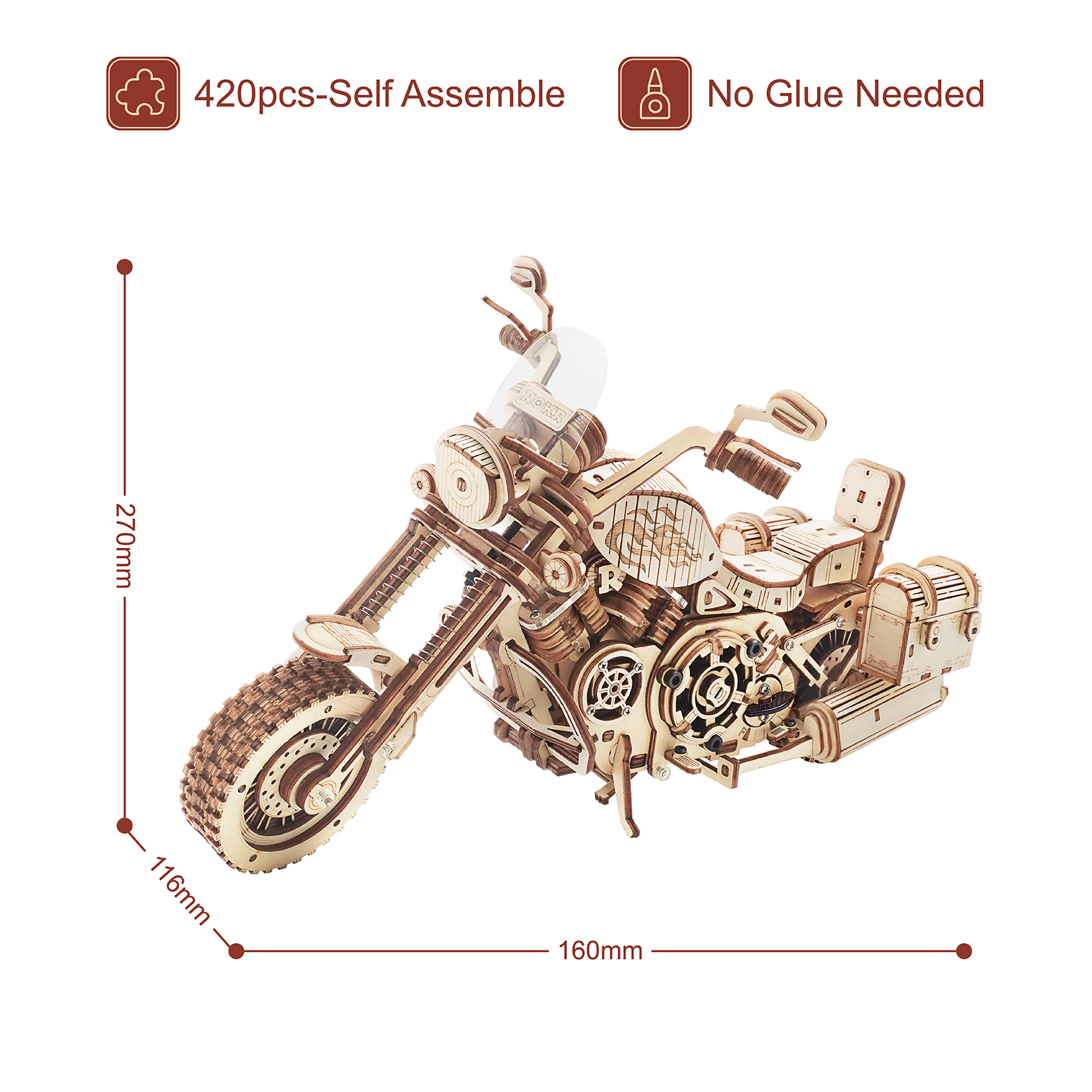 Each piece in this kit is crafted from high-quality wood, meticulously cut and polished to ensure precision and durability. From the sturdy frame to the intricate details of the engine and wheels, every component is designed to fit together seamlessly, allowing you to create a stunning replica of a classic motorcycle with your own hands.