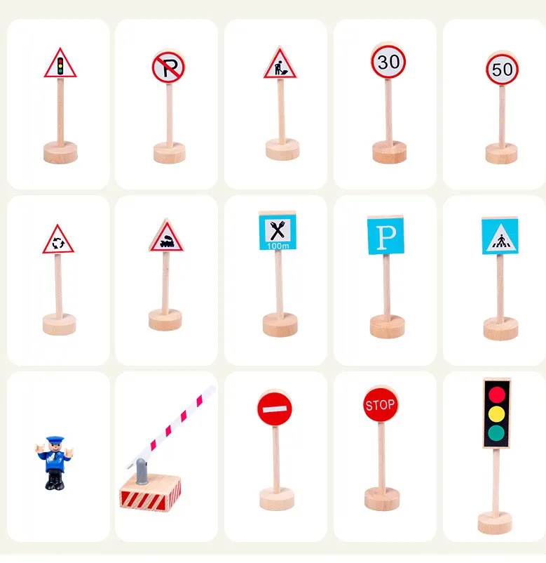 Designed for toddlers and young children, these wooden traffic signs are an excellent tool for developing early cognitive and motor skills. The set includes a variety of essential road signs, making it an ideal addition to any playroom, preschool, or daycare.