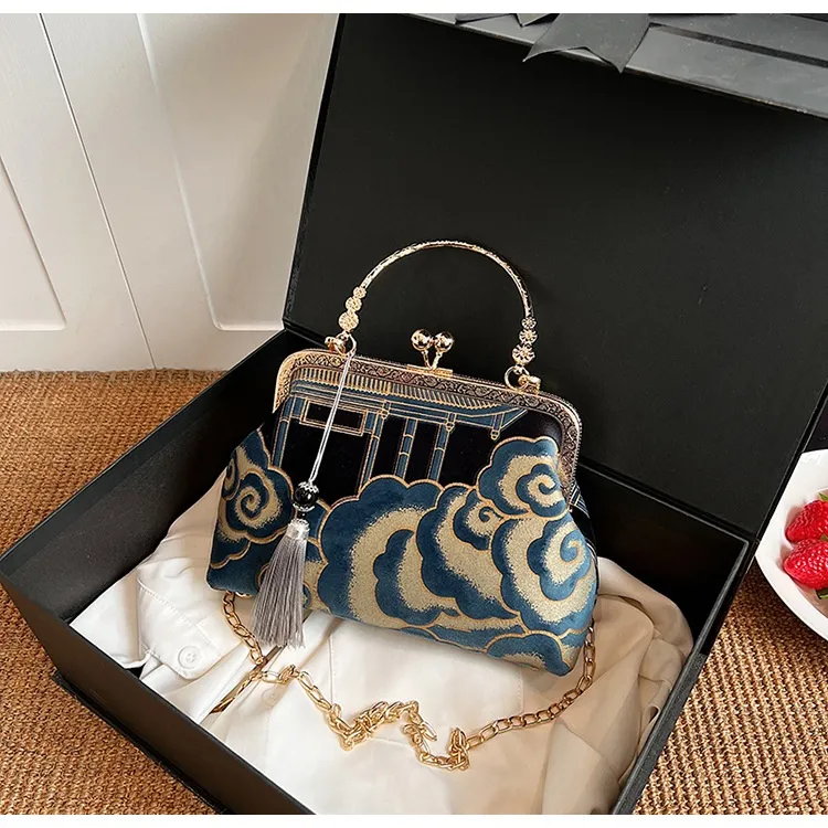 The Xiangyun handbag is inspired by classic Chinese designs, incorporating elegant patterns, embroidery, and symbolic motifs that reflect the rich cultural heritage of China. The craftsmanship, rooted in ancient techniques, gives this bag a refined, artisanal quality. The Xiangyun (meaning "auspicious clouds") motif is often seen in Chinese art and symbolizes good fortune and prosperity, making this handbag not just a stylish accessory but also a symbol of positivity and elegance.