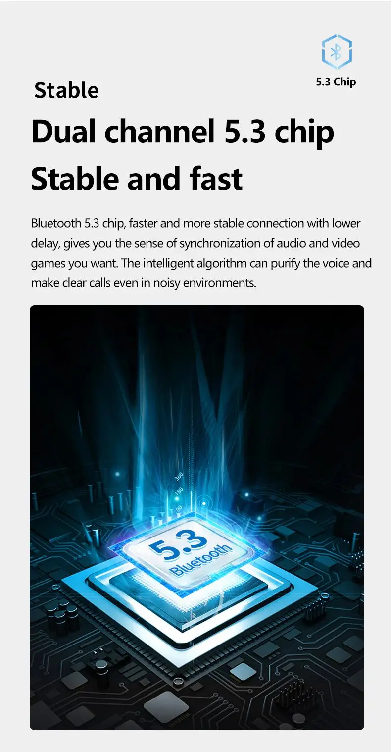 Bluetooth 5.3 chip, faster and more stable connection with lower delay, gives you the sense of synchronization of audio and video games you